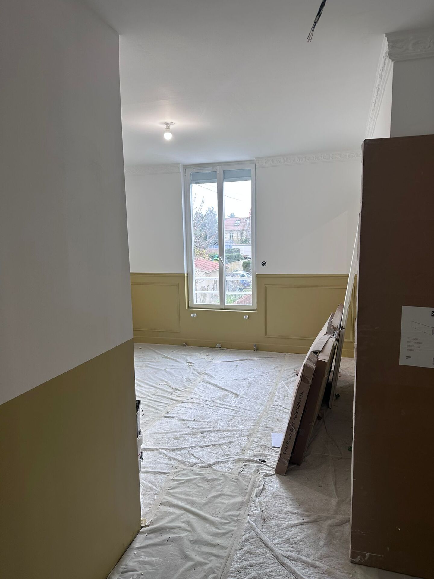 Boiseries basses sur les murs, réalisées dans un style classique et sublimées par une peinture dorée délicate, créant une ambiance chaleureuse et raffinée.